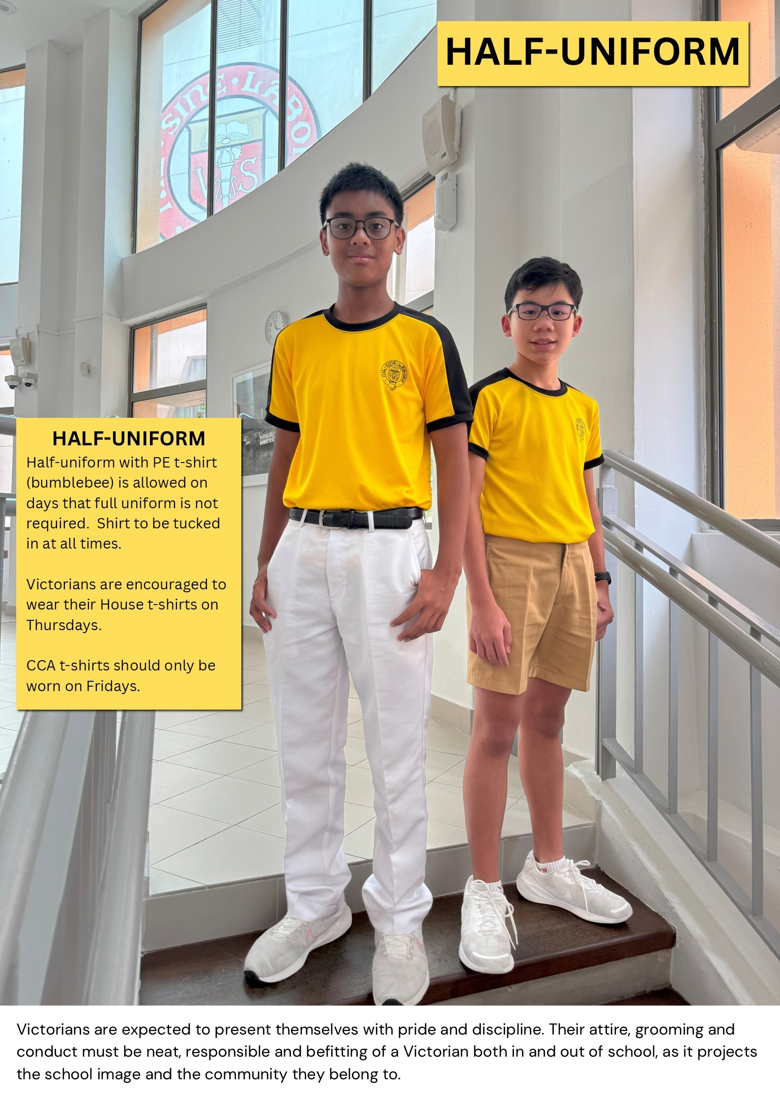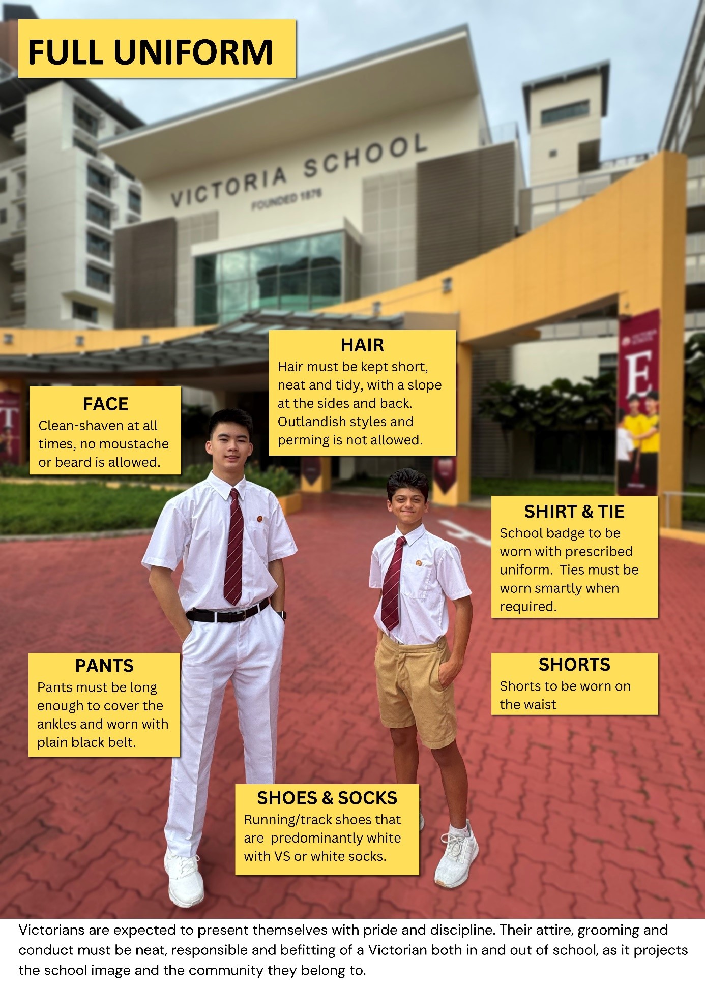 1.2 Victorians are to wear the prescribed school uniform with the school badge and modification to the uniform is not allowed. The school uniform should be purchased from the school bookstore to ensure the correct standard. Shirts must always be tucked. Upper Secondary Victorians must wear the prescribed VS belt or a plain black belt with their long pants.