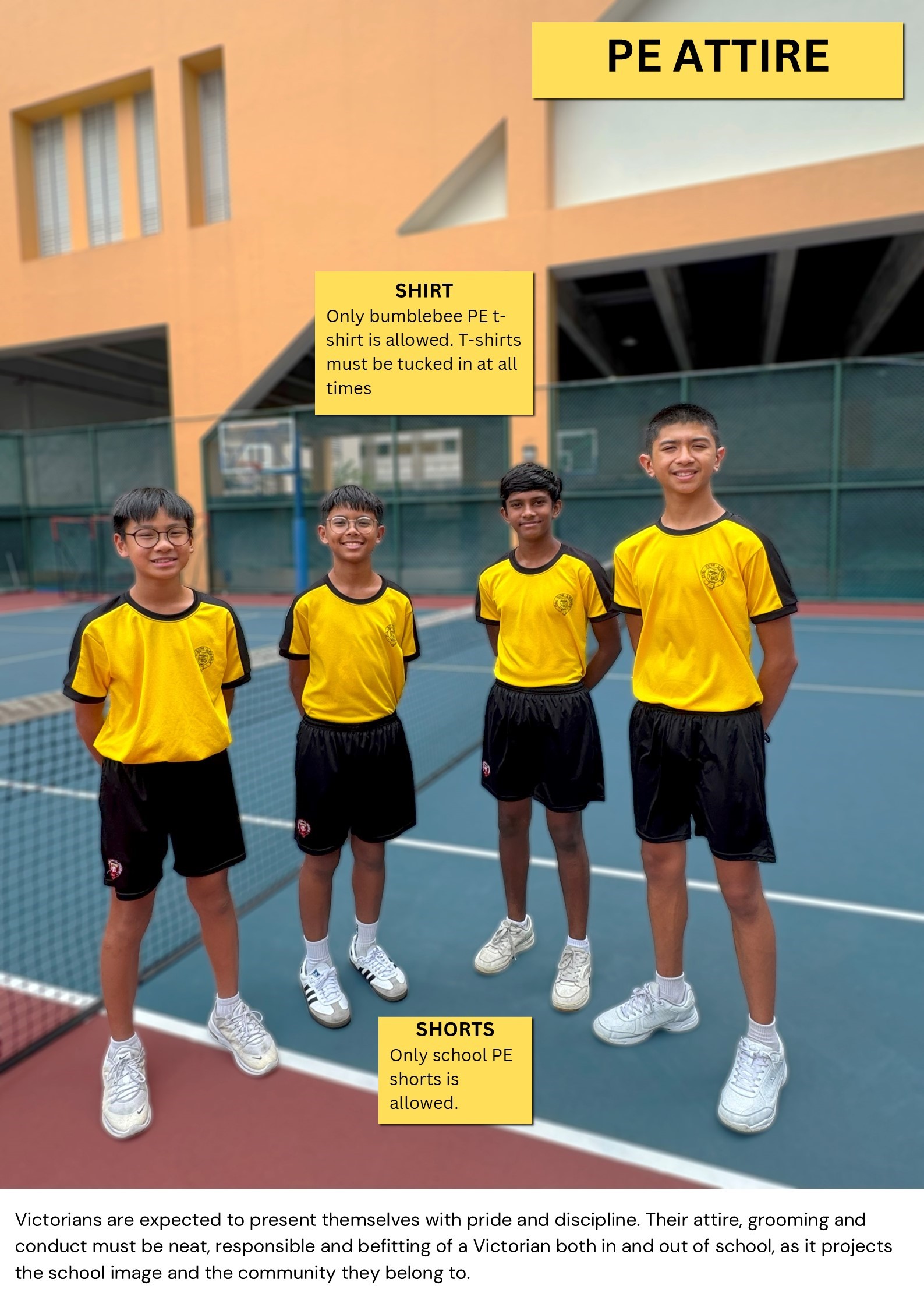 1.3 PE attire is to be worn during PE lessons, games and physical activities. For school-based activities on Saturdays and school holidays, PE attire, House T-shirts or school-based co-curricular activities (CCAs) T-shirts may be worn with proper shoes and socks.